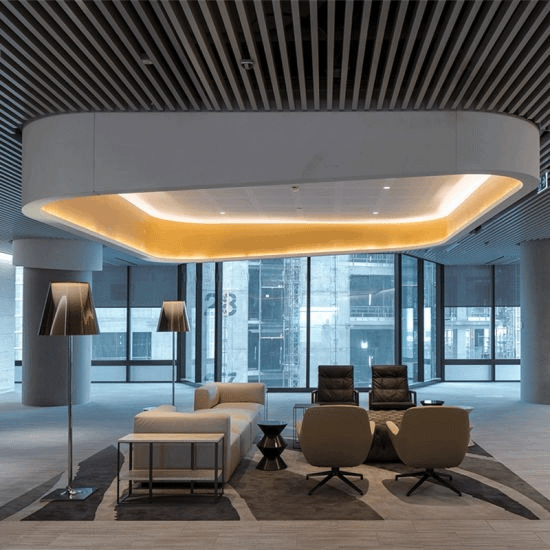 We have regular lay-in and clip-in type ceiling along with the baffle ceiling, easily removable plank ceiling, plank ceilings popularly known as C shaped and F-shaped planks, open cell ceilings, mesh ceilings.